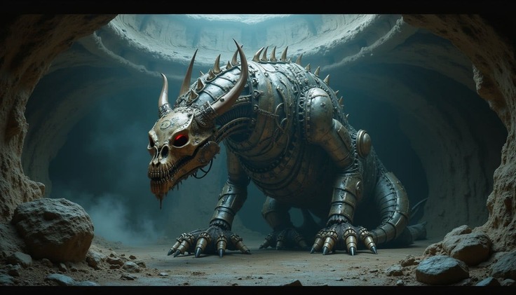 The discovery of a mechanical dragon, blending frightening mythology with forgotten science, reveals a fallen heritage and exploitation theme.